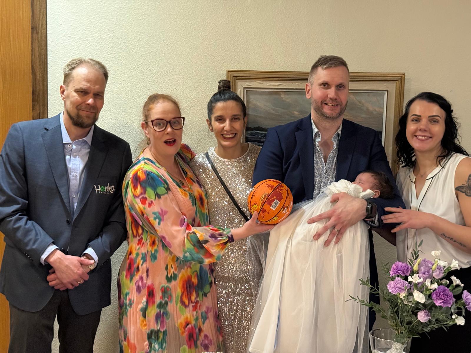 Benjamin Kreanderin ristiäiset Wanhalla Kerholla Kajaanissa 14.2.2026. Benjamin äiti Delaram Kreander (kuvassa keskellä) on pelannut naisten koripallojoukkue HonkaLadiesissa lähes kymmenen vuotta ja toiminut seuran puheenjohtajana kolme kautta vuosina 2021-2024. Kuvassa myös muita koripallon harrastajia osallistumassa kastejuhlaan.